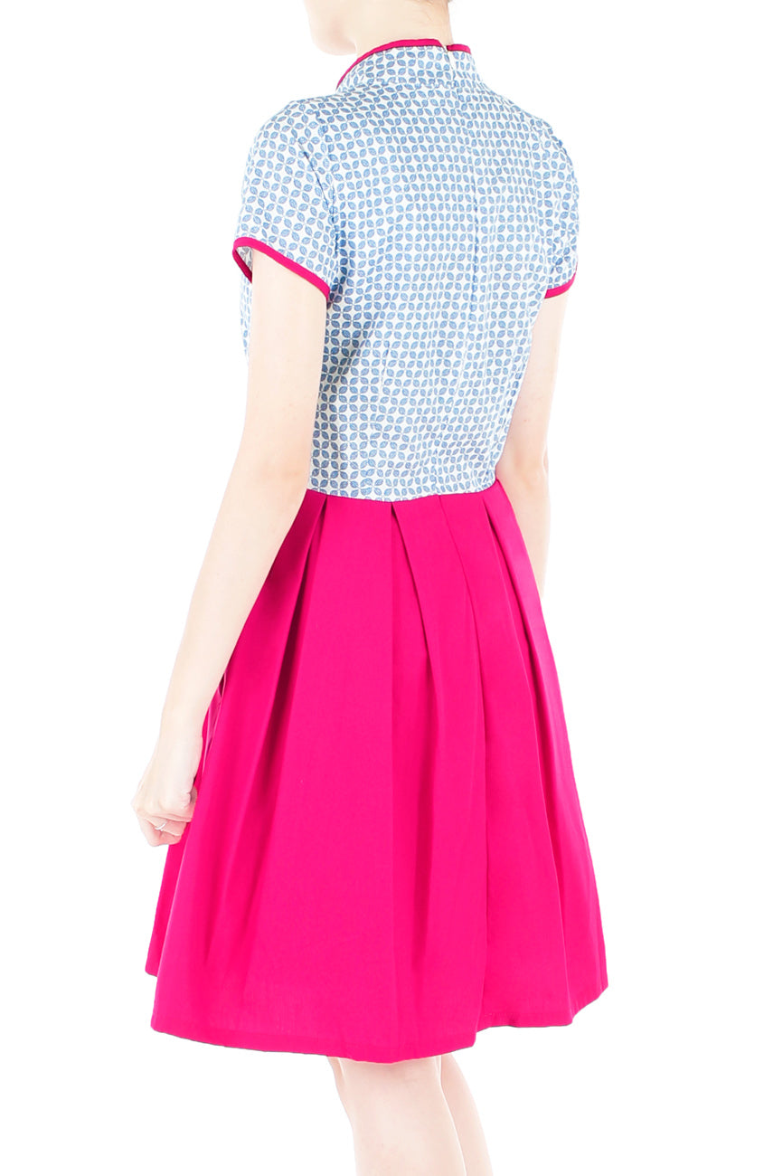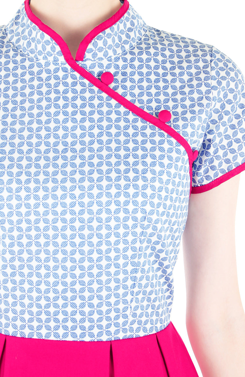 This Chinese New Year, prepare for the endless compliments coming your way in this Korean hanbok-inspired cheongsam that promises to match your glow and positive vibe! Enlightening the bodice with digital prints of four leaf clovers in the classic porcelain white and blue hues, this bright pink cheongsam will enchant everyone at the soiree. Details include: Side pockets, high neck mandarin collars, buttons (non-functioning), short sleeves, double layered top, flare skirt with inner polyester lining and a concealed back zip. Made from 100% cotton – breathable & perfect for the hot & humid New Year weather. Machine washable (colour does not bleed). Handwash for initial wash. Check out its matching kids’ version HERE.