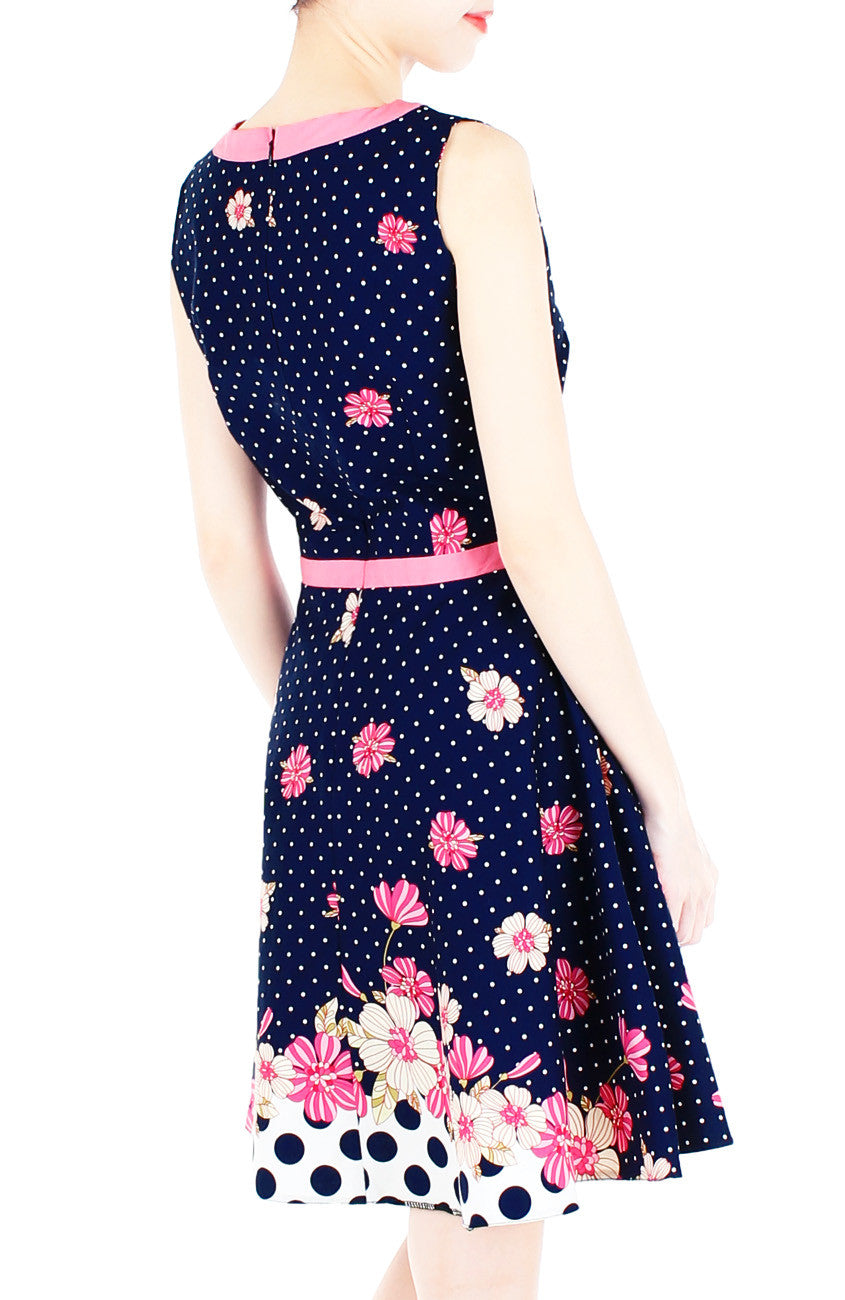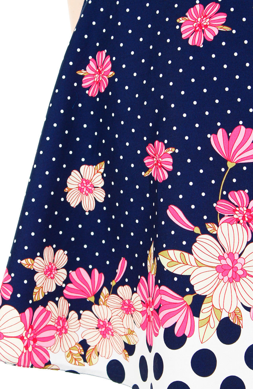 You know the way to a stylish look, and it starts with this dark blue coloured flare dress. Brightened with fresh pink and white striped flowers and white polka dots, this dress is one way ticket to fab fashion! Other details include: Trims at neckline and waist, inner lining, double layered top, hidden back zip and side pockets. Made from cotton.