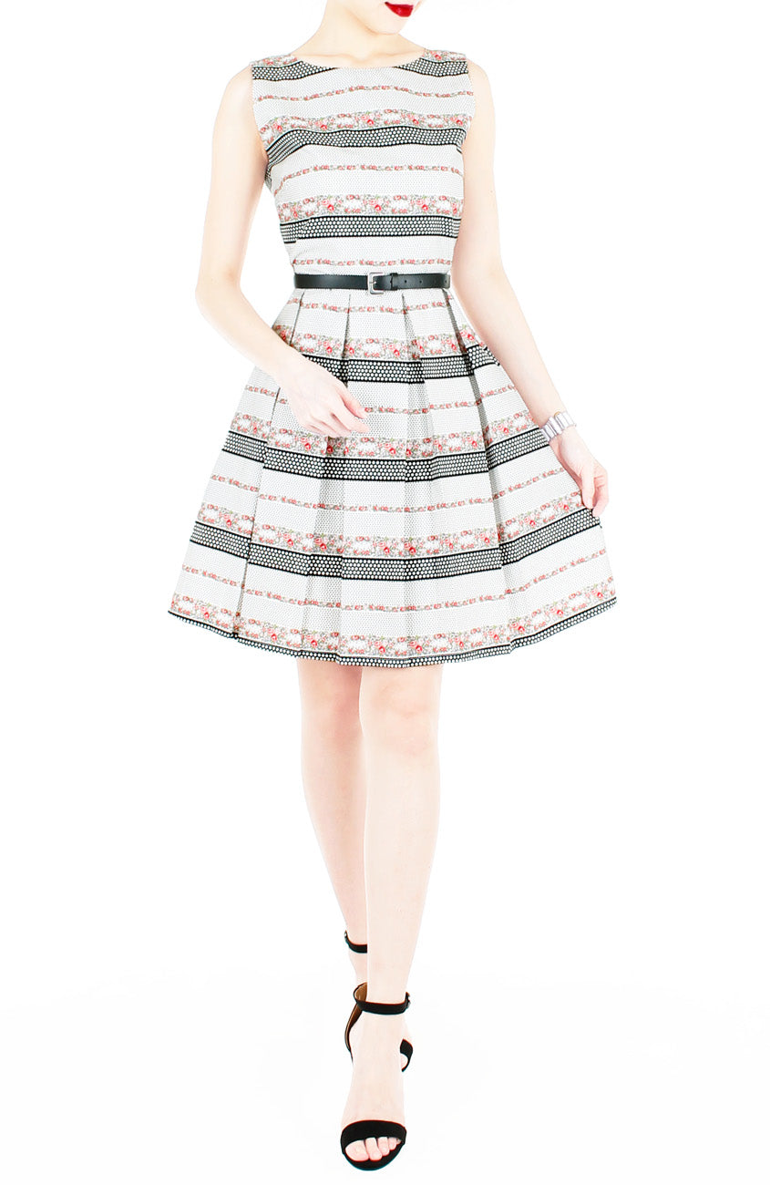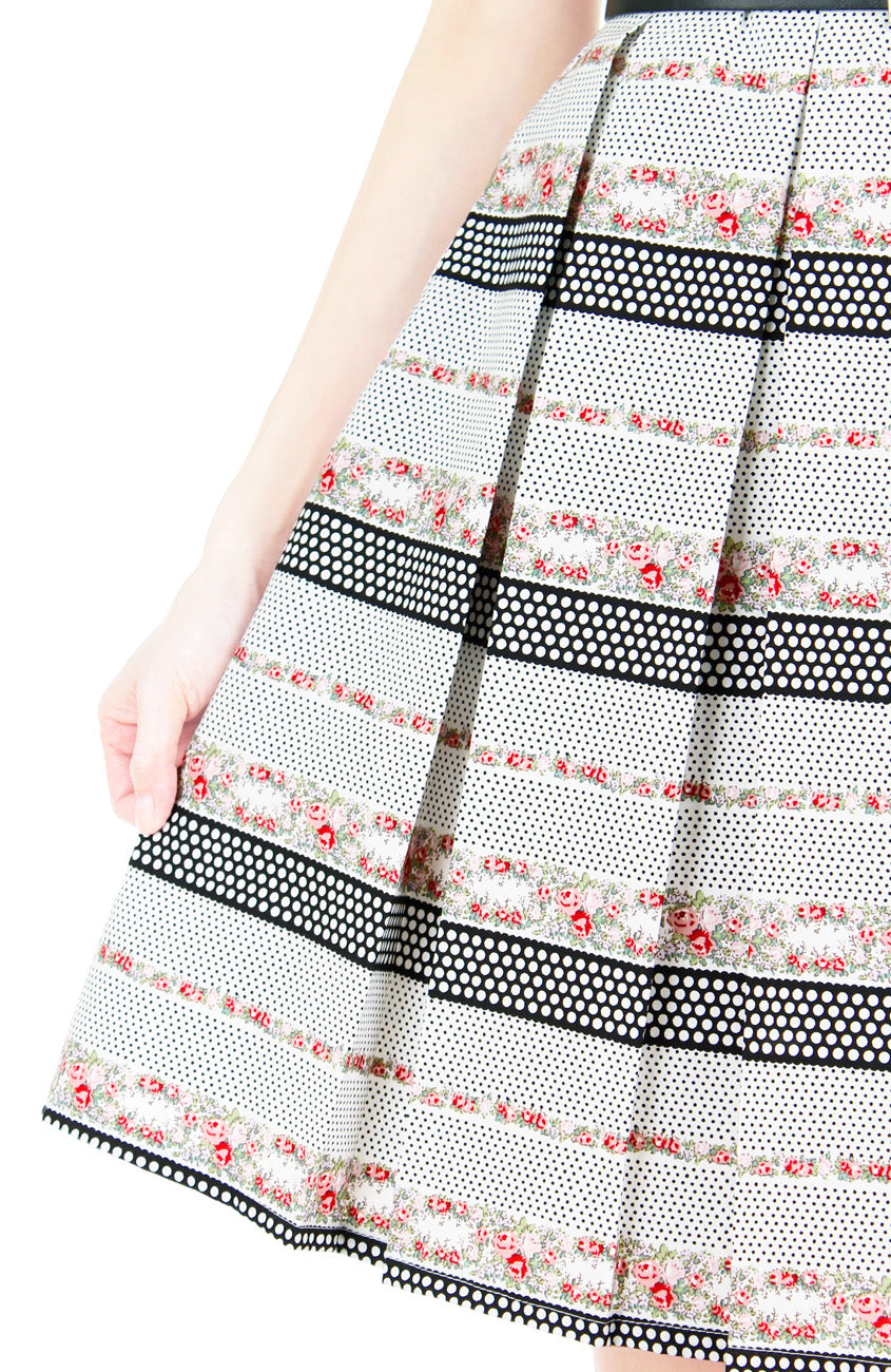 Attendees at the garden party are sure to pause and compliment your pretty dress! Showcasing a tasteful arrangement of roses on vines and polka dots, this dress is the perfect one for the occasion! Details include: Double layered top, flare skirt with inner lining, side pockets and a hidden back zip. Made from cotton.