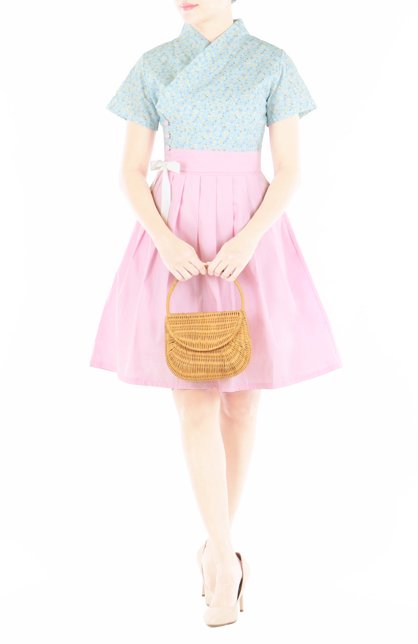 As you gather with friends for a delightful CNY get-together, embrace the charm of the Heavenly Innocence Hanbok. The sea of light blue, adorned with small daisies, creates a whimsical backdrop, perfectly complemented by a light pink skirt, carefully placed buttons, and a white ribbon for that finishing touch. This Whitesoot exclusive is not only perfect for the festive occasion but also a sweet and lovely ensemble suitable for countless charming moments beyond the celebrations.