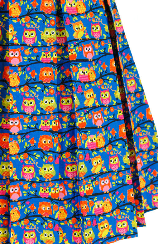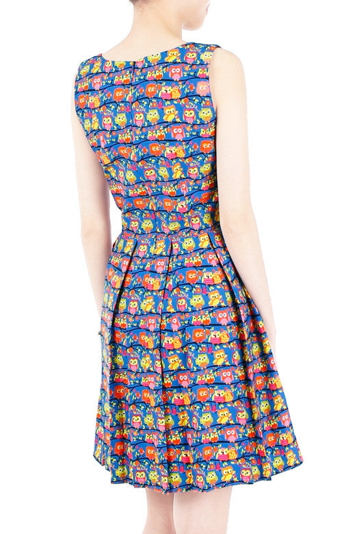 A casual party doesn’t mean you can’t dress up! The adorable, red, pink and green owls and bitty trees adorning this sleeveless dress have you feeling so upbeat, you’re sure to greet everyone you pass with a smile! Details include: Double layered top, pleated flare skirt with inner lining and a hidden back zip. Made from cotton.