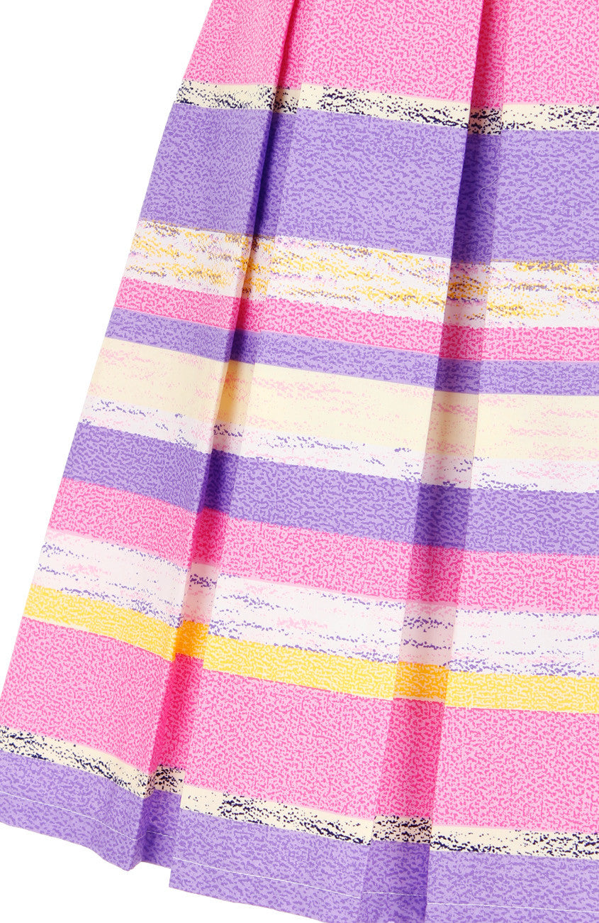 This brilliantly gorgeous striped dress in hues of purple, pink and lemony yellow give a lovely vibe in the office! Details include: Double layered top, pleated flare skirt with inner lining and a hidden back zip. Made from cotton.