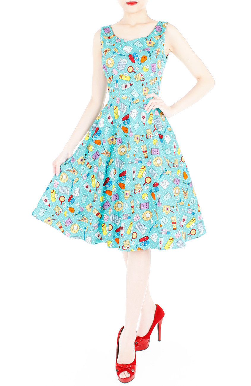 Take your quirk to its fullest potential by donning this adorable turquoise dress with prints of your daily dose of essentials. Find smiling and joyful toilet tissues, shampoo, soap and slippers! Details include: Double layered top, inner polyester lining at skirt, a hidden back zip and side pockets. Made from cotton.