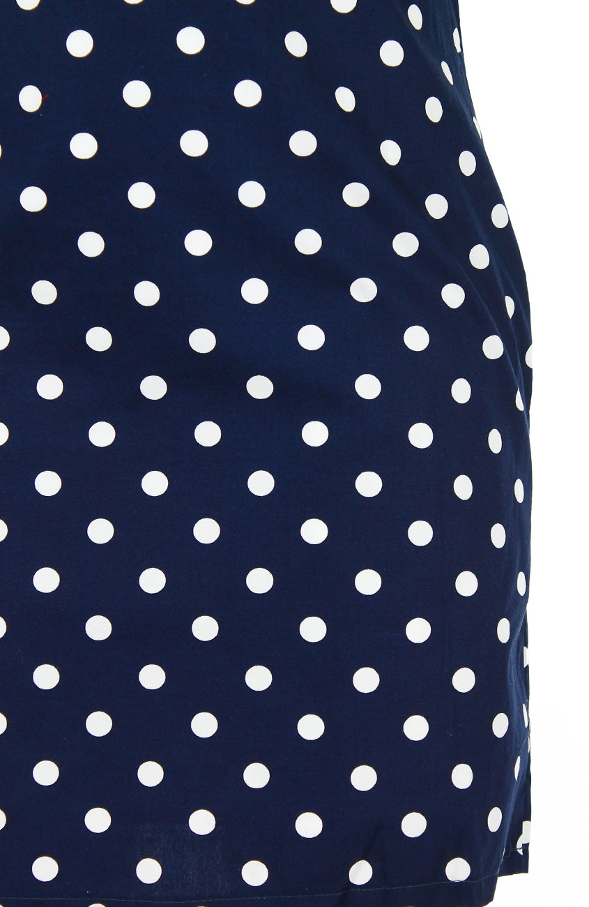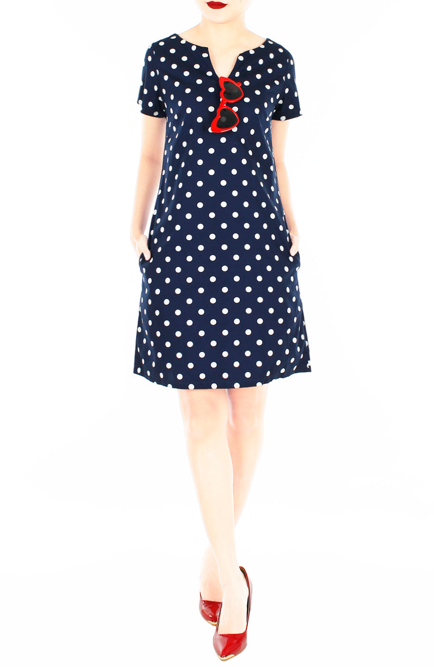You’re sure to bring a pop of playfulness to any party with this polka-dotted shift dress in dark blue with white spots! Made with two-layers of 100% cotton fabric for maximum comfort, this 60s vintage-inspired dress features a notched neckline, short sleeves, hidden back zip and secret pockets at each hip. Machine washable (no colour bleed). Hand wash for initial wash.