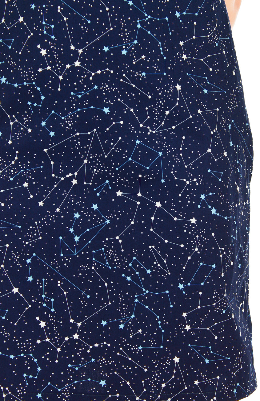 Your magical star moment has arrived and you’re demurely dressed for it in this stellar shift dress in midnight blue. You’ll never let your celestial style fade away when this piece is in your wardrobe! Made with two-layers of 100% cotton fabric for maximum comfort, this 60s vintage-inspired dress features a notched neckline, short sleeves, hidden back zip and secret pockets at each hip. Machine washable (no colour bleed). Hand wash for initial wash.
