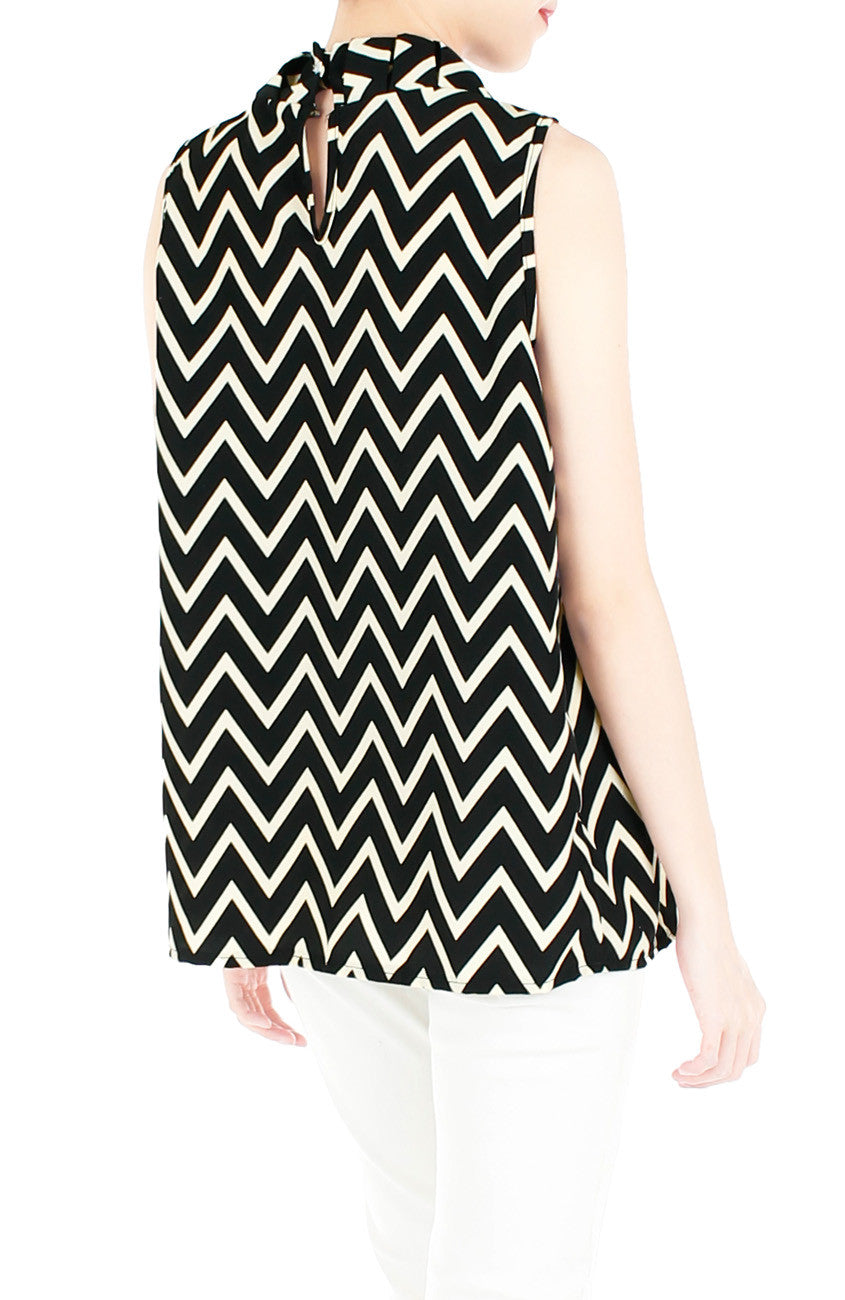 Rely on the timeless sophistication of this black-coloured high neck top with pretty pleat details to complement any look! With its cream chevron print, this billowy top boasts a relaxed fit, a keyhole back with button fastening and an easygoing charm. Made from polyester.