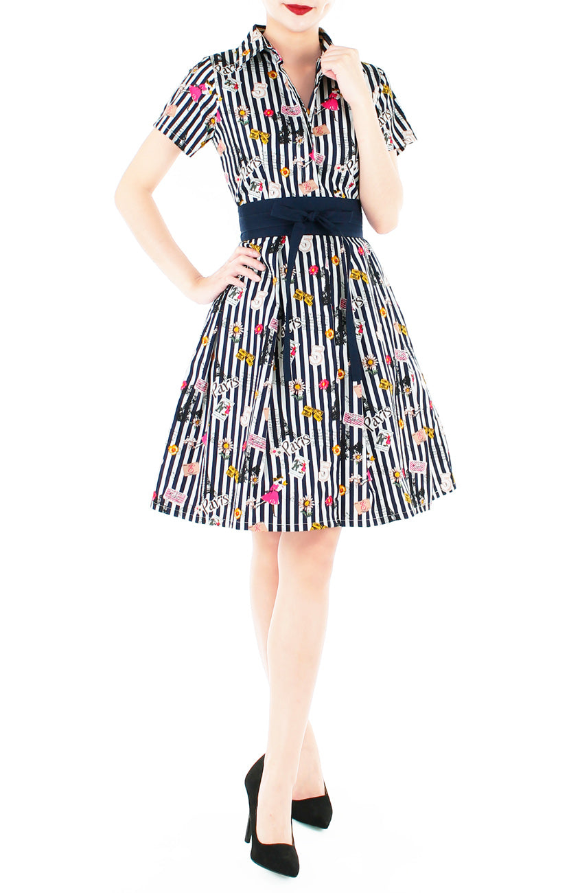 You may hear whispers as you walk down the street wearing this navy striped shirtdress, but rest assured it’s only the sound of fellow stylistas admiring your vibe! With images of Eiffel Tower, vintage Parisian news clips, musical tickets and Parisian ladies carrying baguettes, this dress is one sure way to instant panache! Details include: Double layered top, crisp collars, short sleeves, button down fastening with concealed placket, side pockets and inner skirt lining. Comes with a matching waist sash. Styled here with our Contemporary Obi Belt in Midnight Blue (sold separately). Made from cotton – breathable & machine washable (no colour bleed). Hand wash for initial wash.