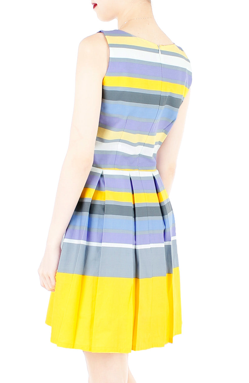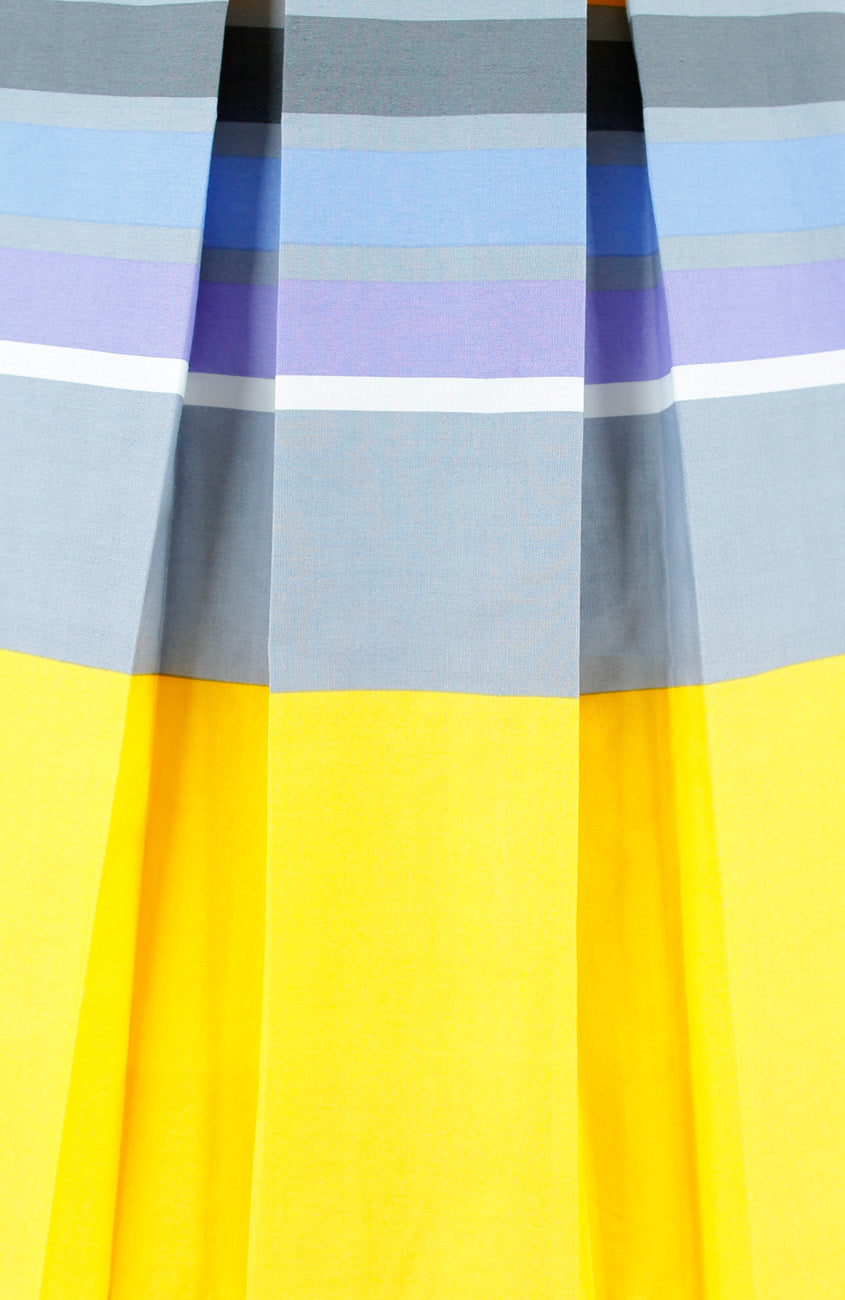 Nothing pulls you out of best better than the promise of flaunting this happy-coloured dress for the day! Striped in yellow, blue, violet, white and charcoal gray, this beauty is an expert at bringing your inner abundance outward! Other details include: Double layered top, inner skirt lining, side pockets and a concealed back zip. Made from cotton.