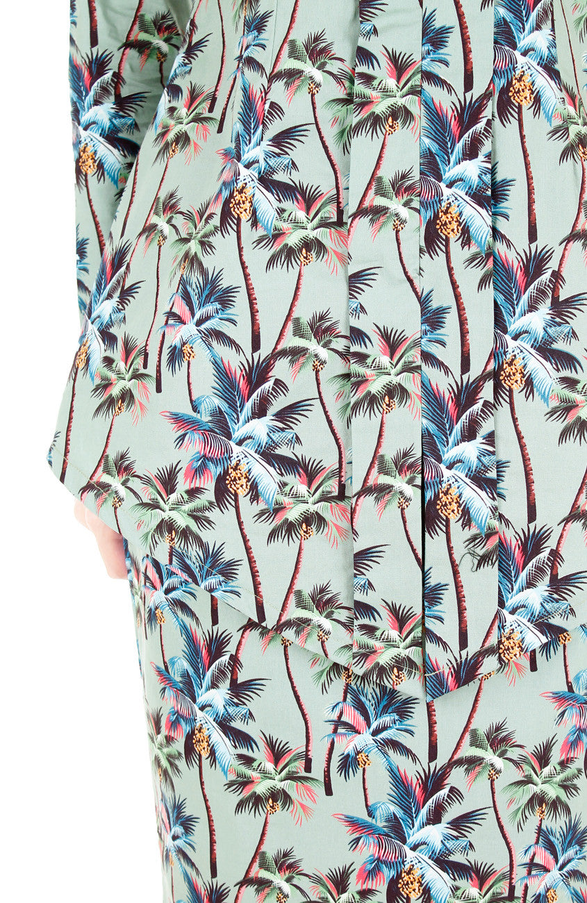 Let’s hear it for this playful palm printed kebaya! Festively covered in a colour-bursting palm tree pattern, this modern kebaya deserves admiration and acclaim. Details include: Blouse (hidden front zip, hidden zip at sleeve opening, nipped-in waist), skirt (elastic waistband, hidden side zip, wrap front). Made from cotton.