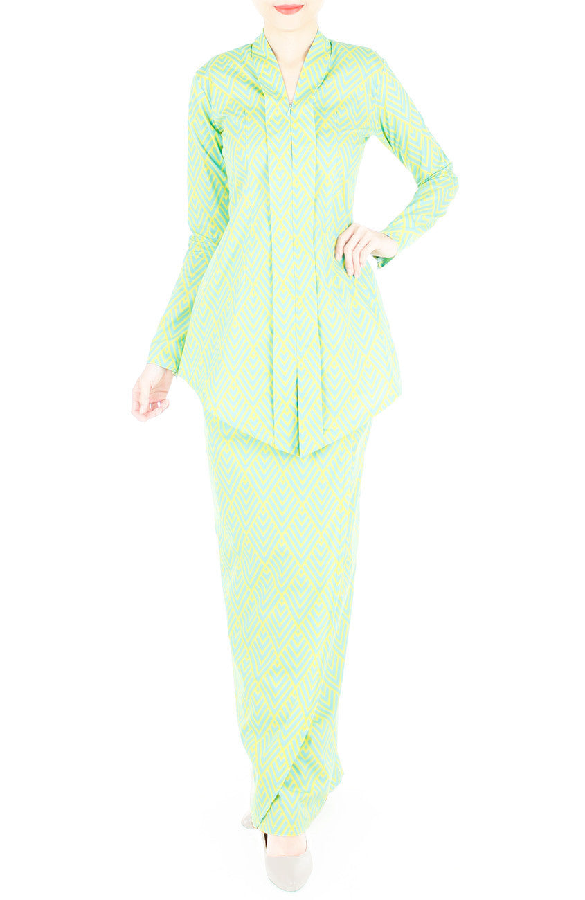 Jazz up your day with the enlightening shade of lime green and yellow on this modern kebaya! Part of our capsule collection, this happy set will mimic your astute attitude! Details include: Blouse (hidden front zip, hidden zip at sleeve opening, nipped-in waist), skirt (elastic waistband, hidden side zip, wrap front). Made from cotton.
