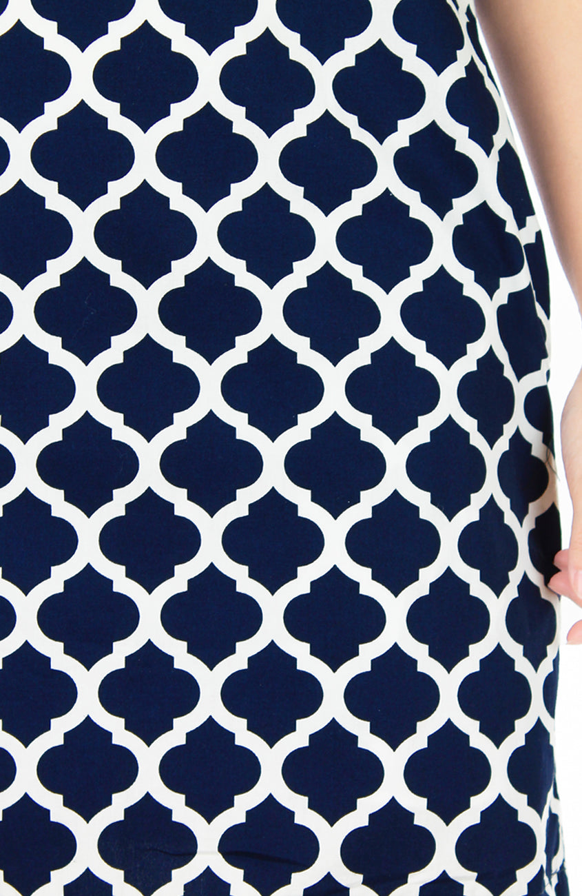 Every clothing choice tells something about your personality - so what will this dark blue and white Moroccan mosaic patterned dress say of your style? Between its shift dress design, notched neckline and hidden pockets, this piece reveals you’re unique as can be! Made with two-layers of 100% cotton fabric for maximum comfort, this dress features a notched neckline, short sleeves, hidden back zip and secret pockets at each hip. Machine washable (no colour bleed). Hand wash for initial wash.