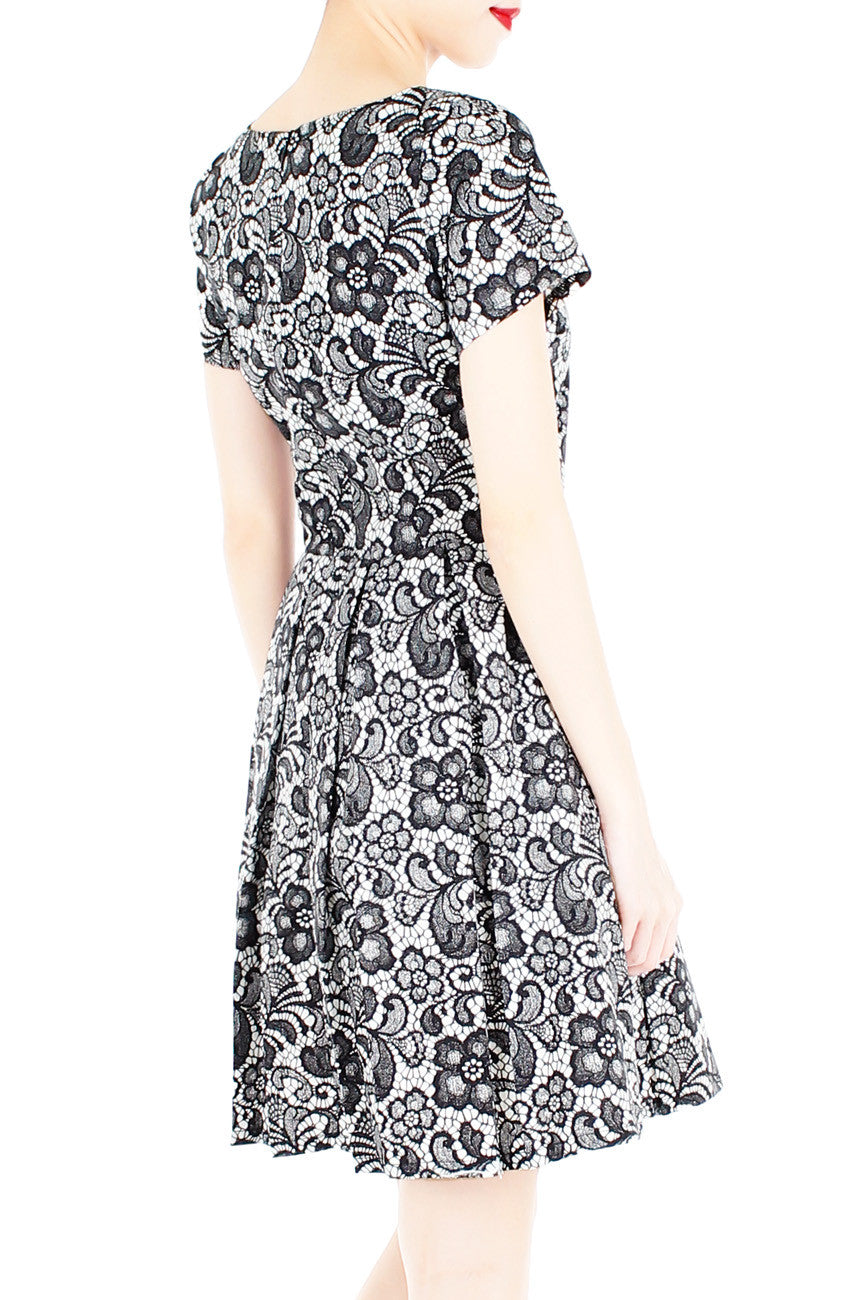 Assembling a look of unparalleled class is your calling, which you demonstrate by flaunting this black lace printed flare dress! With double layered top, short sleeves, a flare pleated skirt with inner lining and a hidden back zip, this stunning dress showcases your elegant expertise. Made from cotton.