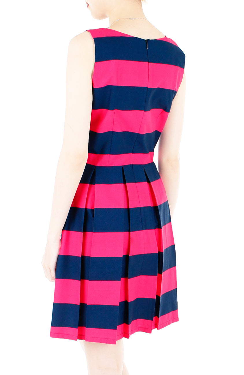 In need of a luck booster? Look no further than this navy and fuchsia striped flare dress! This dress will make any day brighter! Details include: Double layered top, pleated flare skirt with inner lining, side pockets and a concealed back zip. Made from cotton. Accessories are excluded.