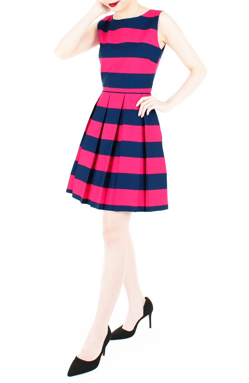 In need of a luck booster? Look no further than this navy and fuchsia striped flare dress! This dress will make any day brighter! Details include: Double layered top, pleated flare skirt with inner lining, side pockets and a concealed back zip. Made from cotton. Accessories are excluded.