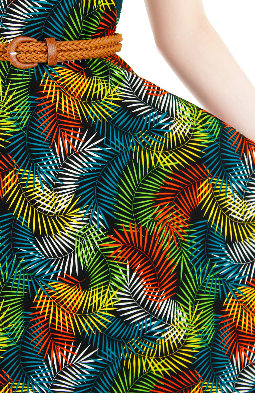 Island vibes go wherever you do – as long as you’re donning this dress! With colourful palm prints on a black background, this retro-inspired dress is an exotic addition to your holiday wardrobe! Details include: Double layered top, flare skirt with inner lining, side pockets and a concealed back zip. Made from cotton.