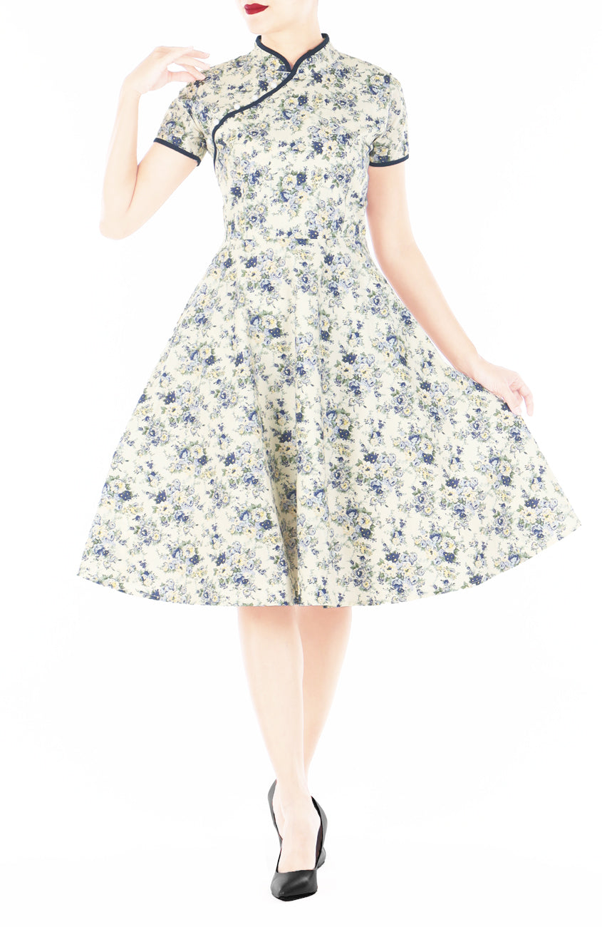 You are at a Chinese New Year office party with colleagues, effortlessly standing out in The Era of 1950s Cheongsam. With its ivory base and soft blooms in pastel yellow and blue, this piece exudes vintage charm and grace, reminiscent of the timeless elegance of 1950s cheongsams. The pearl buttons add a touch of sophistication, making this cheongsam perfect for an evening of celebration and connection. Step into the new year with a sense of style that’s both refined and unforgettable!