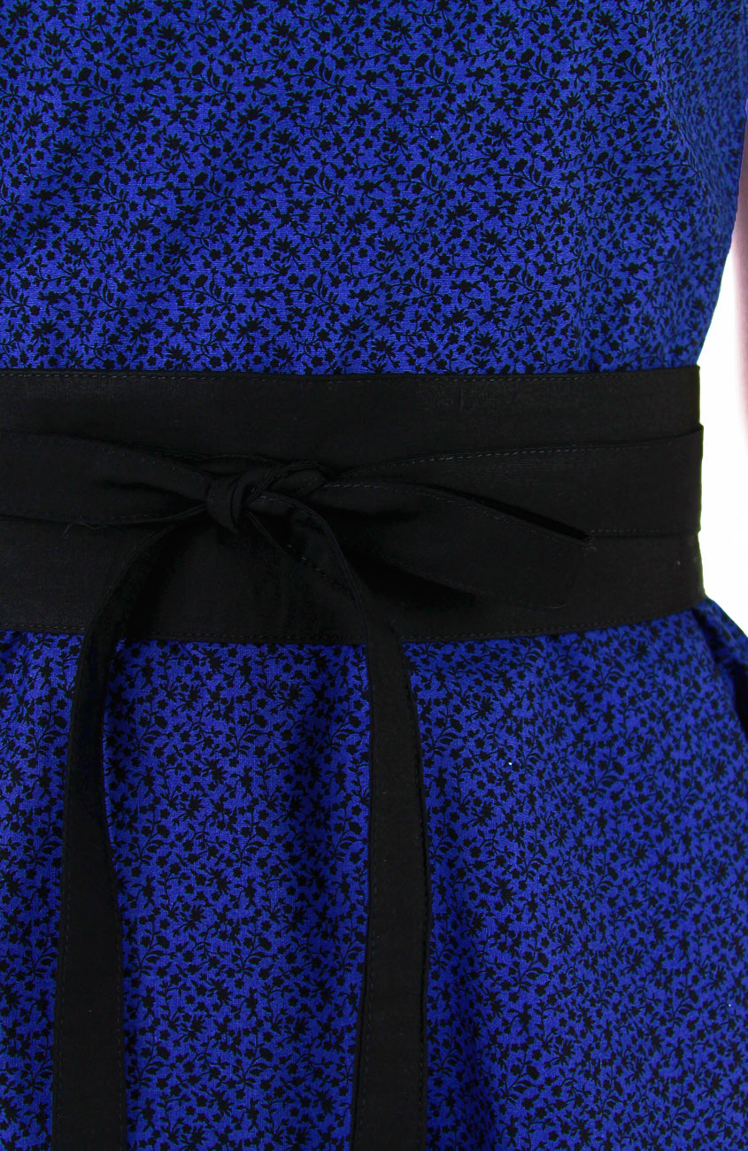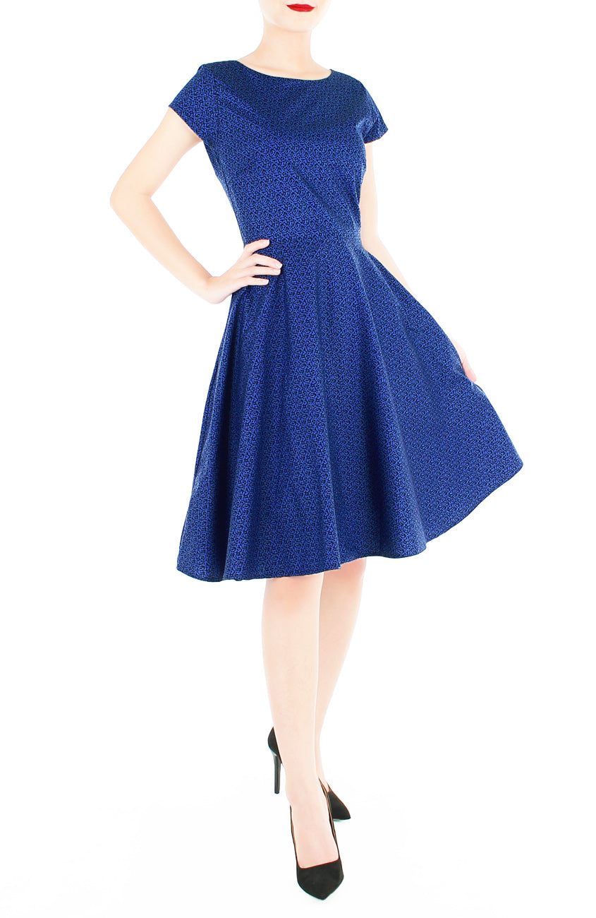 Every time the sun shines is an opportunity to twirl about town in this dark azure blue dress with black vines. Daylight is perfect for this subtle petite pattern, but the fun doesn’t end there. This lovely piece is just as divine in the evenings, too! Other details include: Double layered top, flare skirt with inner lining, side pockets and a concealed back zip. Styled here with our Contemporary Obi Belt in Noir Black. Made from cotton – breathable & machine washable (no colour bleed). Hand wash for initial wash.