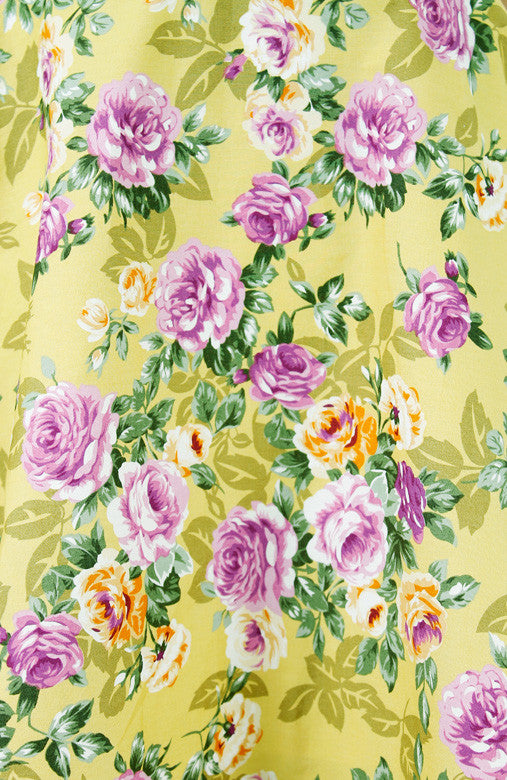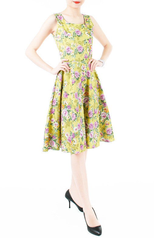 Set out in this yellowish green floral dress, and others will surely congregate around your stylish sensibilities! This cotton A-line features a square neckline, low waist cut, and ever-coveted flare skirt with side pockets amid its violet and golden yellow blooms, making it a beacon for coquettish fashionistas everywhere. Other details include: inner lining, double layered top and a hidden back zip. Made from cotton.