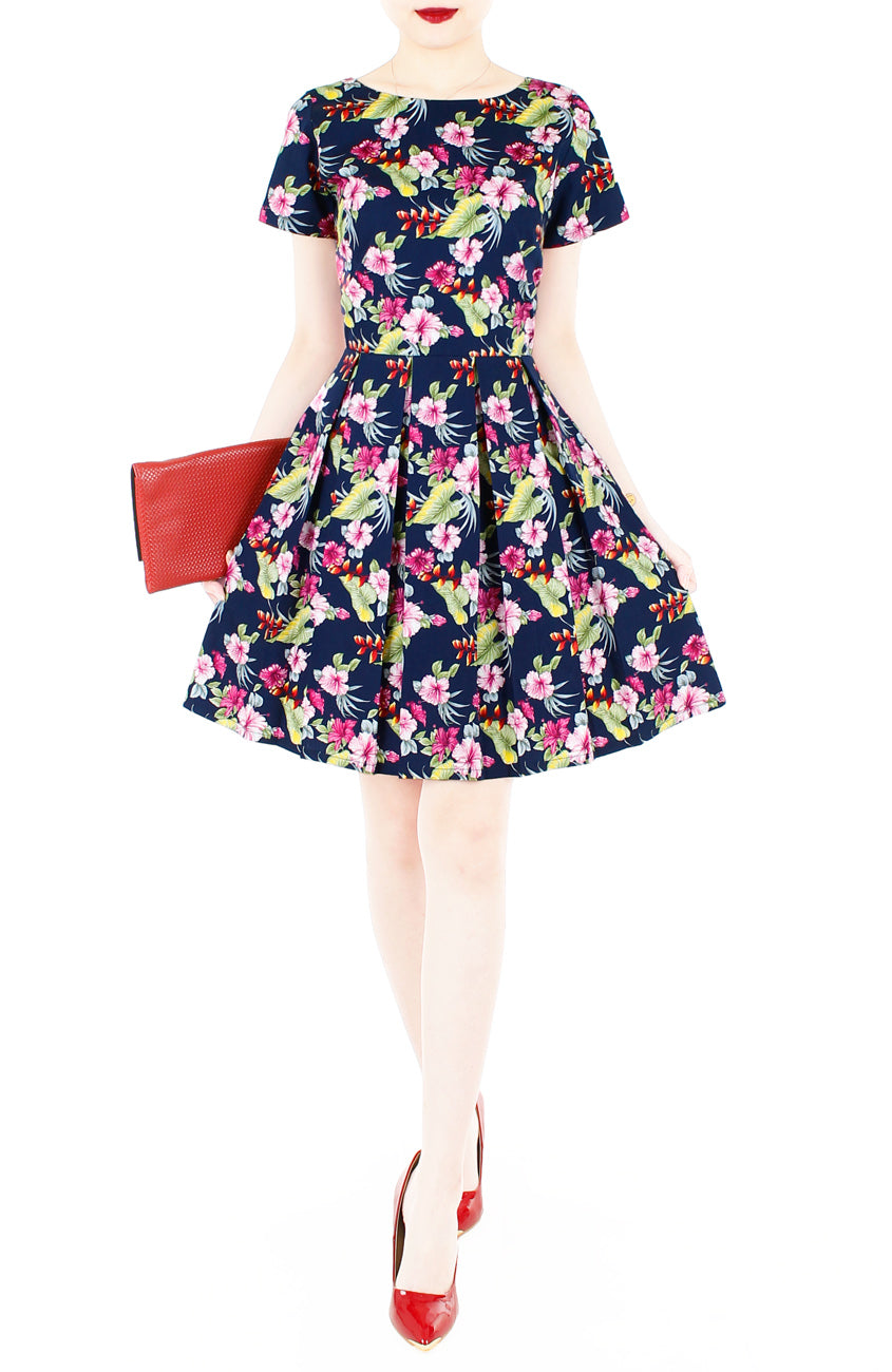 Rocking this blue dress is always a classy yet fun decision – no party plans necessary!  But, if friends care to stop by while you’re styled in this pretty hibiscus and palm printed dress, you won’t say no! This pocketed dress is a real delight! Details include: Double layered top, short sleeves, pleated flare skirt with inner lining, side pockets and a concealed back zip. Made from cotton.